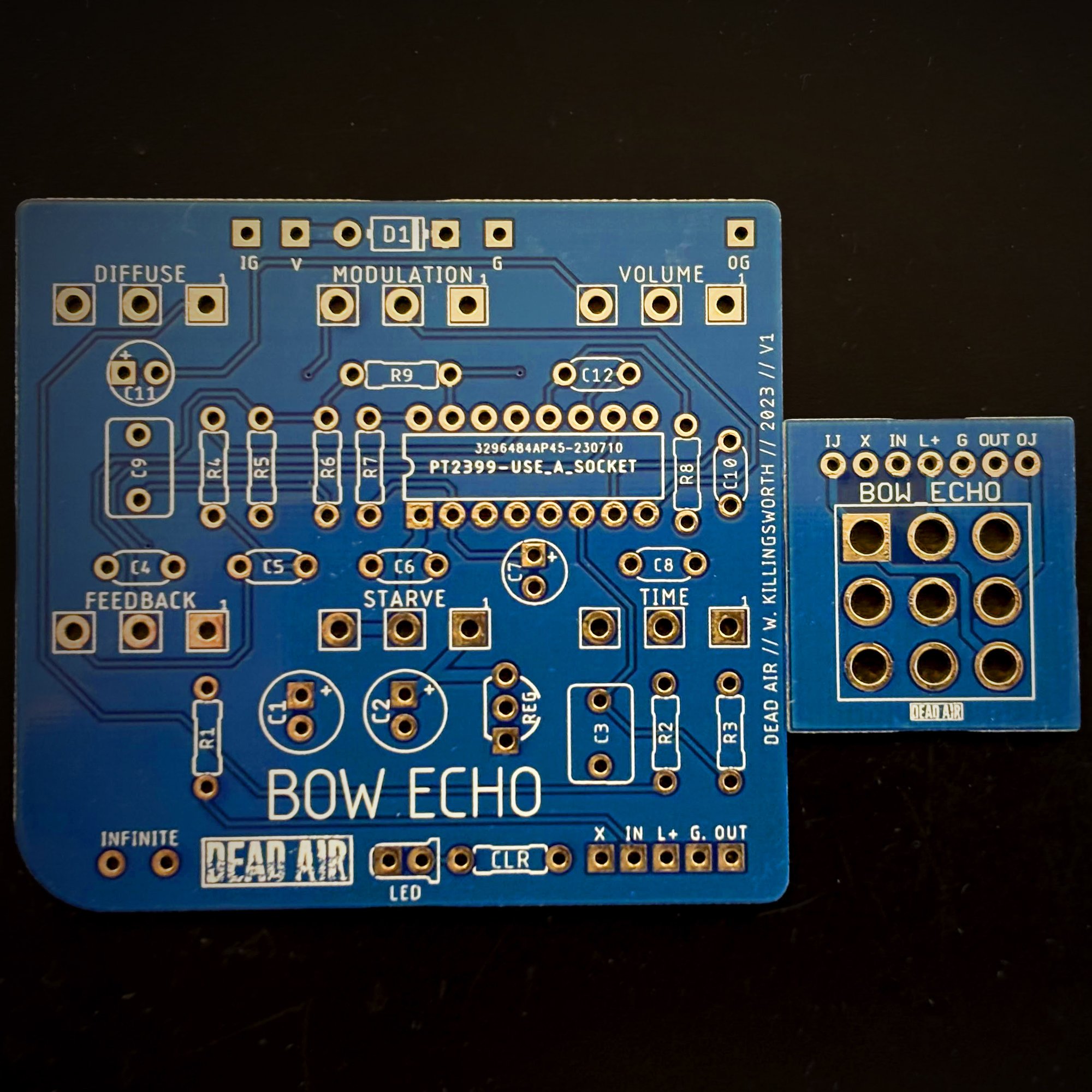 When developing the Hook Echo pedal, I was exploring and refining a sound that I could hear in my head, but was unlike the assorted pt2399 fuzzes and weirdness already in the world. The classic DIY references of the Noise Bomb and Noise Ensemble have a crunch in the delay tails that gives them their unique character and personality. That crunch wasn't what I wanted in the Hook Echo, but then I started thinking about creating something in-between but still different from all of the above, and thus the Bow Echo was born.